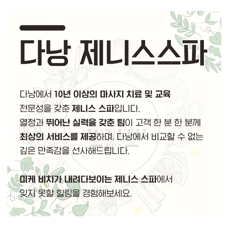 스카이라운지 다낭제니스 스파에서 눈과 몸 모두 힐링을 경험해보세요.